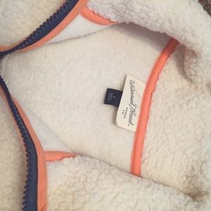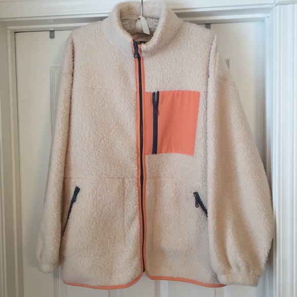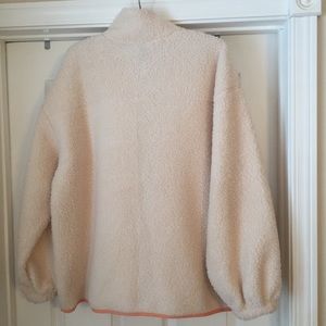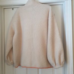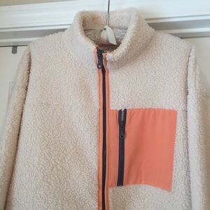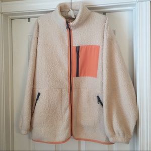 Universal Thread Top Large, like new, polyester/spandex, soft and warm, peach trim on white faux fur, front zipper, 3 front zipper pockets, stand up collar, Cute.