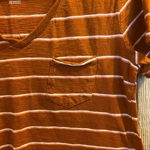 Orange, light pink, and white striped universal thread (target brand) v-neck. Size small.