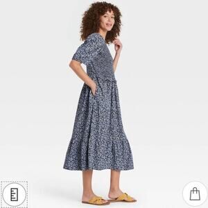 Universal thread size xs floral smocked dress, on seam hip pockets.