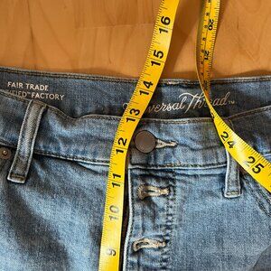 Universal Thread Vintage Straight Jean in size 16, or 33R with styles rips and dying. High Waisted with buttons.