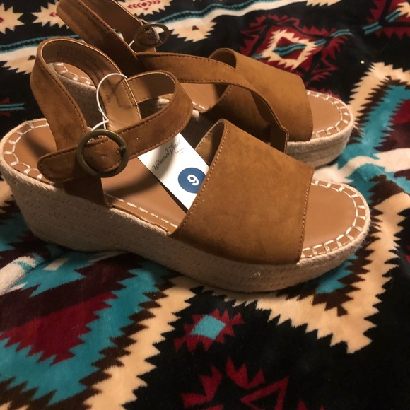 Size 9. Never Worn, with tags. Light brown faux suede wedge