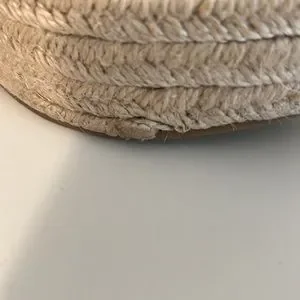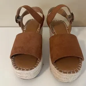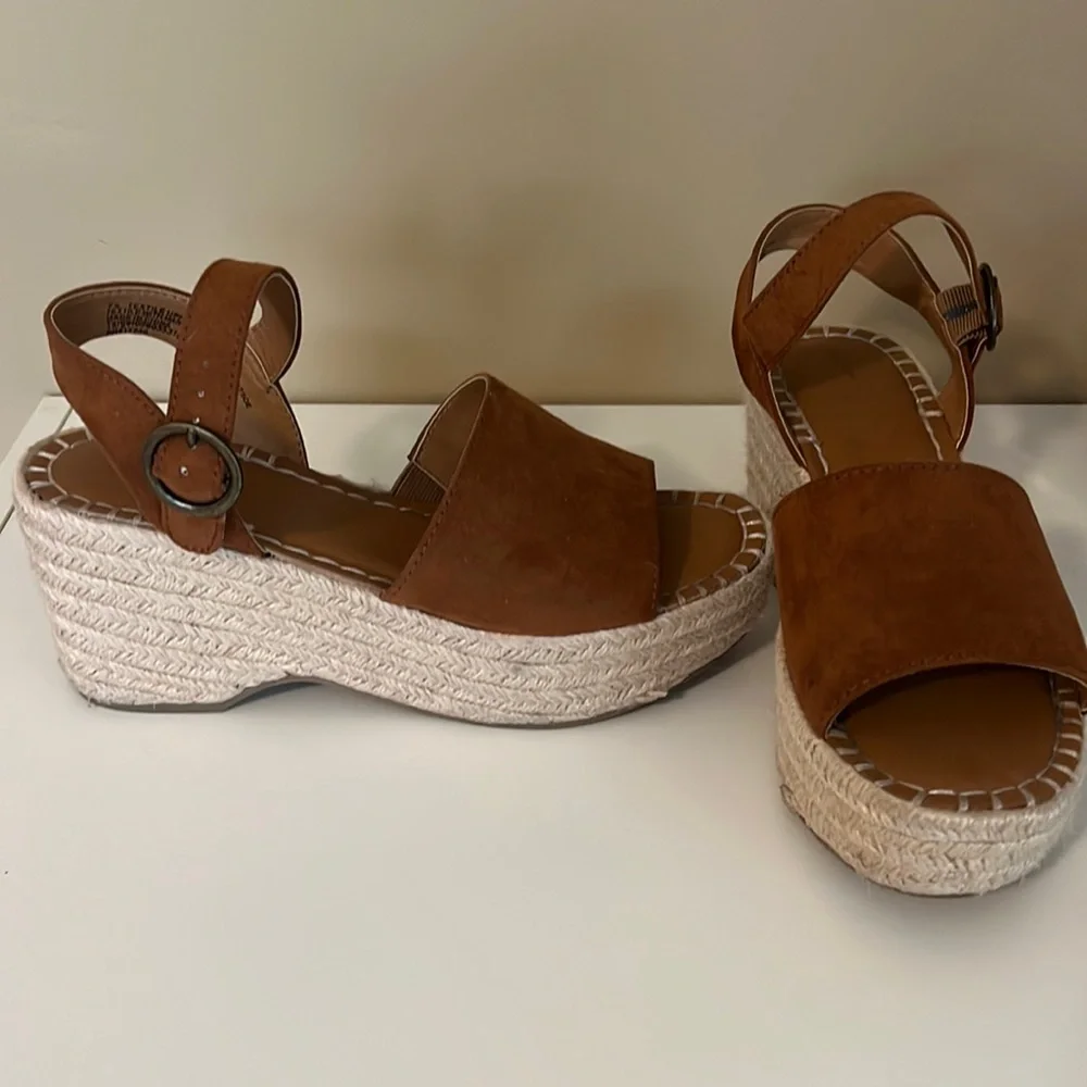 Universal Thread wedges. Brown suede. Size 7.5. 3” wedge. Good used condition. Buckle closure. Has a small spot on front and a few loose jute pieces(see pictures). Please ask questions before purchasing.
