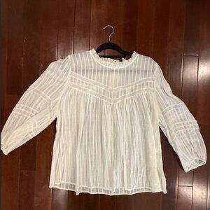 Lightweight and airy Universal Thread peasant-style blouse in a soft white / ivory tone, featuring subtle vertical sheer stripe texture throughout. Designed with a relaxed round neckline and a decorative yoke across the chest and shoulders, accented by delicate pintuck-style trim that creates a flattering, flowy silhouette.