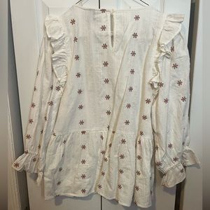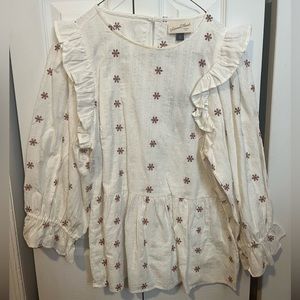 white ruffle and embroidered floral top from the target brand universal thread. The shirt has been one once if at all and is in perfect condition. It's very light weight so it's better for the spring and fall or if you live in a warmer climate. There are ruffles on the front and a button that closes it on the back