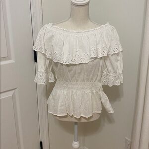 Elegant white blouse with ruffled design. Perfect for casual wear. Such a cute top that is light makes a beautiful outfit with jeans/trousers/skirt, any occasion!