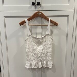 Chic white camisole with ruffled hem. Perfect for layering or wearing alone. Adds elegance to any outfit.