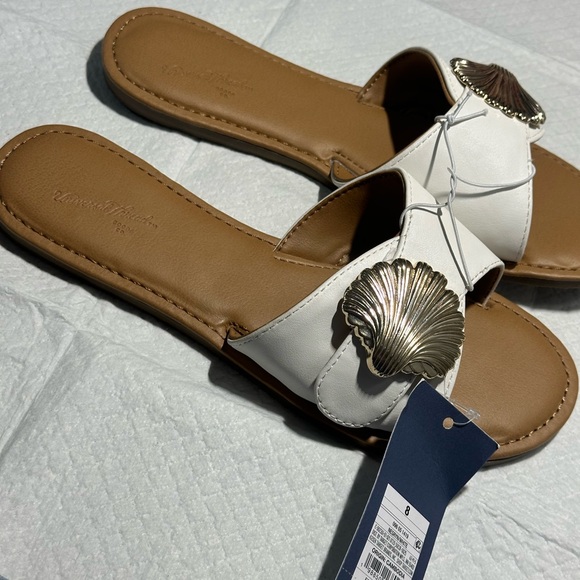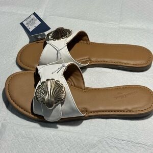 Chic white sandals with gold shell accents. Perfect for casual outings.