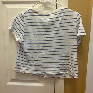 Stylish tee with blue stripes. Soft fabric. Ideal for casual outings.