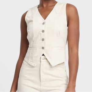 Stylish white vest. Button-front design. Sleeveless with pocket details.