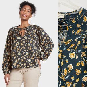 Universal Thread Women Top Medium Long Sleeve Tie Front Blouse Gray Floral New