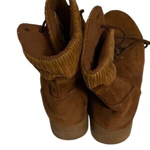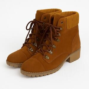 Universal Thread women’s boots in size 11, designed in a rich brown suede-like material with hiker-inspired details. These stylish ankle boots feature a cozy ribbed knit fold-over collar in mustard yellow, lace-up front with antique brass eyelets, and a modest stacked heel. Heel measures approx. 2" and shaft height is approx. 5". Durable lugged rubber outsole offers comfort and traction for everyday wear. Versatile style pairs well with jeans, leggings, or casual dresses. Pre-owned and in very good condition with minimal signs of wear. Perfect for fall and winter wardrobe rotation.