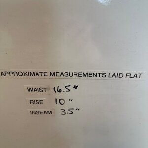 • Approx. measurements: Waist 16.5", Rise 10", Inseam 3.5"