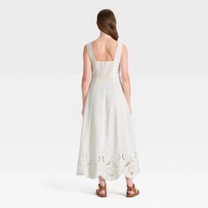 Elegance meets comfort in this Midi A-Line Dress from Universal Thread. Made of cotton-blend fabric, this sleeveless dress features a scalloped detailing around the neck, shoulder sleeves, and hem, and is adorned with eyelet design on the bottom for a timeless look. It is fashioned in a scoop neckline and boasts a smocked back for a customizable fit. Accessorize it with your choice of sandals and a handbag to complete the ensemble.