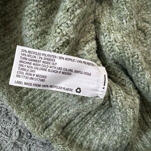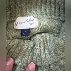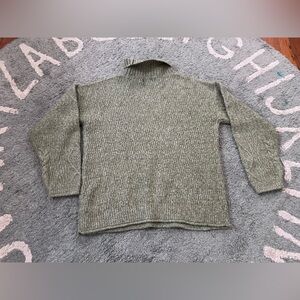 Elegant olive sweater with a cozy cowl neck. Features a classic cable knit pattern. Perfect for layering.