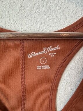 Lightweight racerback tank with a scoop neckline. Soft knit fabric for everyday layering. Warm rust tone pairs well with neutrals. Simple, versatile wardrobe staple.
