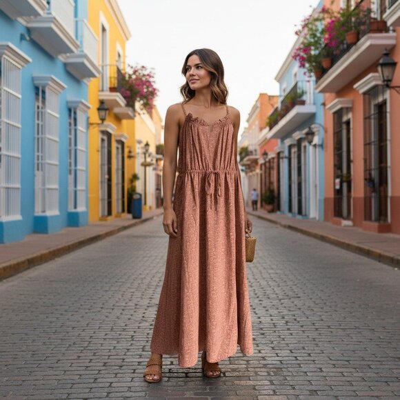 This sleeveless maxi dress features a flattering drawstring waist and adjustable straps for a customizable fit. Designed with a soft, breathable fabric for all-day comfort.