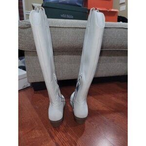 Universal Thread women's Sommer Western boots in off white/ivory color. These knee-high boots feature a pointed toe, low heel, and zipper closure. Made of faux leather with a 100% TPR outsole, they offer comfort and are suitable for various occasions such as activewear, casual outings, or parties. With a standard shoe width and block heel style, these boots are a stylish and versatile addition to any wardrobe.