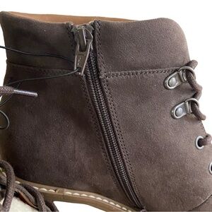 Crafted with an ankle-height silhouette, these faux-suede heeled boots feature tonal front laces and a sherpa tongue for hiker-boot style that's easy to pair with your favorite cool-weather wardrobe pieces. You'll step with confidence on the 3.75-inch stacked heel thanks to its block design, and the adjustable fit the front laces offer is sure to set you off on the right foot. Plus, there's a zipper at the inner ankle that makes pulling them on and taking them off again a cinch