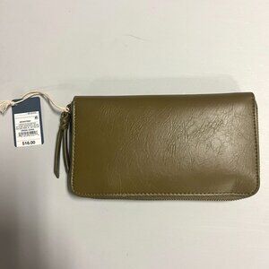 Keep your essentials closet at hand with this Zip Wallet from Universal Thread?. This zip wallet makes a practical accessory for everyday use. It features a structured rectangular silhouette in a neutral tan faux-leather finish for a look that coordinates with any outfit. Designed with a secure zip closure on the main compartment it opens to reveal an inner zip pocket and multiple compartments to make organization neat and simple. Plus it can be carried on its own or in your handbag for versatile use. Universal Thread?: The denim collection that s true to you.