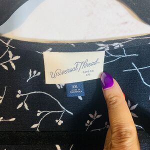 This Universal Thread blouse in size XXL features a wrap-style front with a romantic black and white floral print. The flattering silhouette includes long sleeves with gentle gathers and an adjustable tie hem at the waist for a custom fit. Lightweight and breathable, this top is perfect for casual outings, fall festivals, brunch dates, or styled under a denim jacket for early autumn.