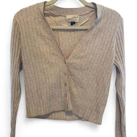 Chic beige ribbed sweater. Button-up design with long sleeves.