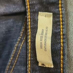 Dark blue denim. High rise stretch. Size 18/34S "short". Pre-owned in great condition, no damage. Raw edge leg hem. See photo