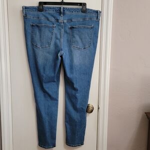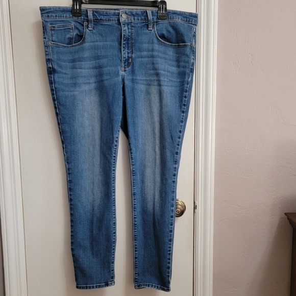 Universal Thread mid-rise skinny jeans, size 18/34R, gently used ftom a 2020 Target purchase. 71% cotton/27% polyester/2% Spandex; machine wash and dry. Measures 41" around waist inside belt loops; rise is 10.5" and inseam is 28". Slight tear in crotch area where fabric is thin.