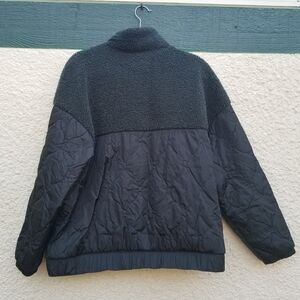 Cozy mixed media jacket with a dark green sherpa upper and a black nylon quilted lower. Dual zippers from top and bottom. Zippered chest pocket, slip pockets at hips. No known flaws. See photos for fabric and care details.