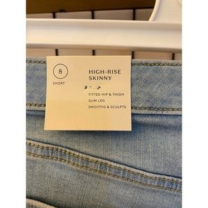 NWT, Universal Thread skinny jeans in light wash size 8 short. These jeans have a lot of elastic so they are sure to fit great. They are a high rise fit, slim through the leg, and fitted through the hip.