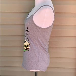 Like new women’s gray sleeveless tee with spaghetti straps and “We finish each other’s “ in