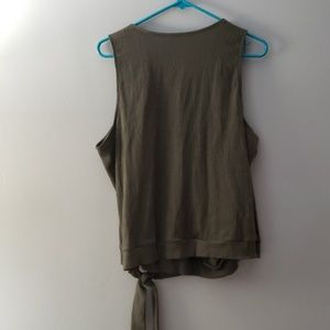 Olive green, ties on bottom left, snap closure in the middle. Excellent used condition