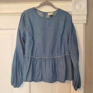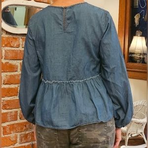 Relaxed fit with a ruffled hem, balloon sleeves, keyhole closure with a tiny button at the back of the neck.
