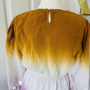 Features: Super cute and fun ombré pattern with fun colors. A little puff to the sleeves. Comfortable material. Would be a perfect Thanksgiving outfit.