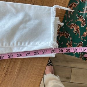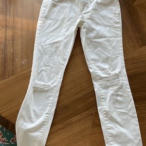 White skinny jeggings, high rise and distressed. Raw hem. 9 1/2 inch rise, 28 inch inseam. Excellent used condition