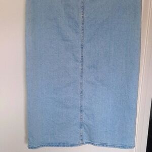 Elevate your style with this chic light blue denim skirt. Perfect for casual outings or a day at the office. 2 front pockets, 2 back pockets with zipper and button closure. Waist 14.5 Length 38" Split 21"