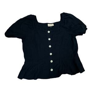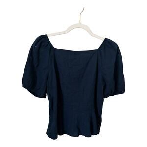 From Universal Threads...Navy blue linen peasant top has puff sleeves and buttons down the front. This top is a fit and flare style.