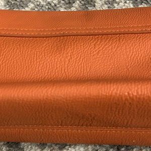 This listing is for a wallet or cosmetic clutch bag. It is simulated leather, orange and snaps closed. It has one big pocket and a very small, zippered pocket inside. It measures 7.5" across the bottom, and 5" deep. This bag is made by Universal Thread Goods Company. This bag is preowned in excellent condition. It comes from a smoke free home.