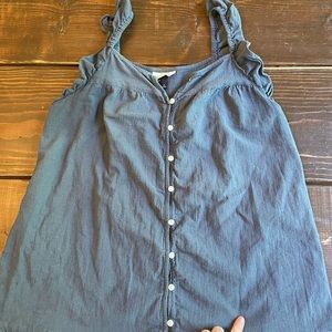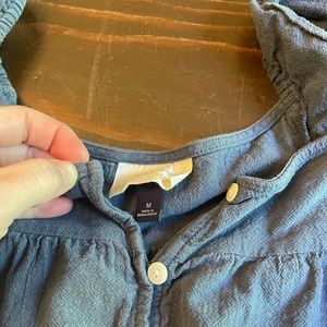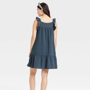 Universal Threads Ruffle Summer Dress in navy blue. A couple light detergent spots I never noticed until now, and the top button doesn’t button. Could fix, but I always preferred it unbuttoned.