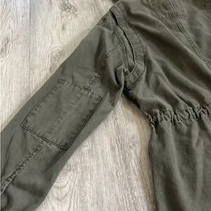 Essential Utility Jacket! Hooded, lots of pockets, cute drawstring at waist, reinforced elbow. Color is a dusty police. Perfect for any season and in good used condition.
