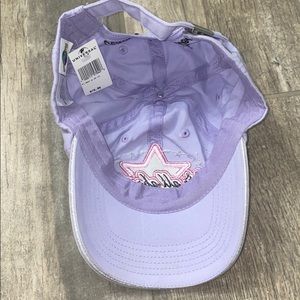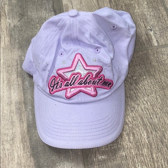 “It’s all about me” with star. Lilac (light purple) cap with dark/light pink star and black font. Standard youth size.