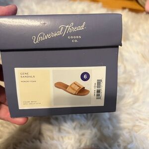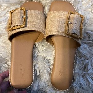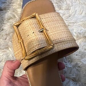 Step into style with these chic raffia slide sandals. Perfect for any casual outing, these tan sandals offer both comfort and elegance. Only worn a few times, great condition.