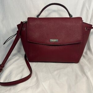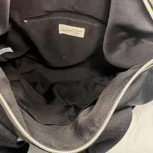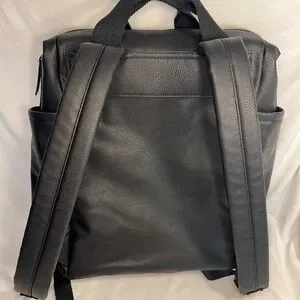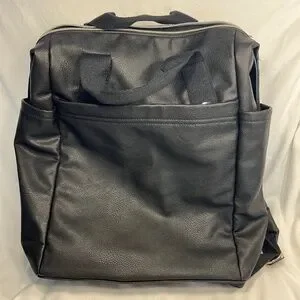 Black PU leather. Never used but no tags attached. Two smaller pockets and zipper pocket inside, two side pockets and large front zipper pocket.