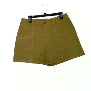 Universal thread, deep dark mustard/olive green khaki outdoor style, sturdy canvas high rise midi kinda a cargo like, shorts with lots of pockets. Not too long, and not too short camping, hiking, outdoorsy, versatile shorts.