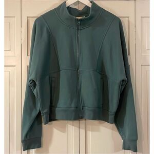 Description: cotton poly blend quarter zip pullover crop with pockets