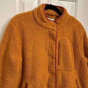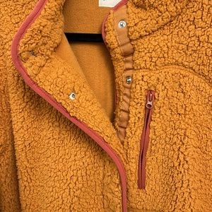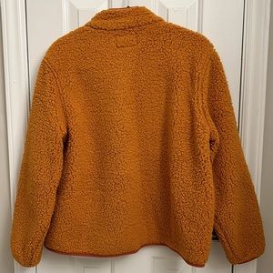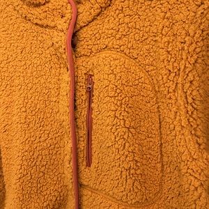 Button up. Two side pockets, one zippered breast pocket. Extremely soft and warm. Gently worn, excellent condition.