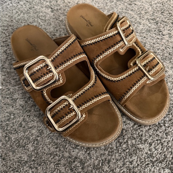 Excellent condition, only worn once or twice. No major wear at all. Buckles are adjustable. Material is a faux suede.