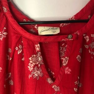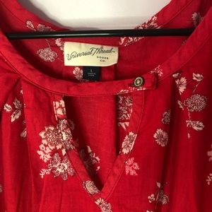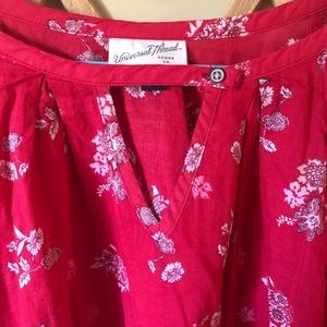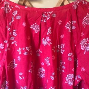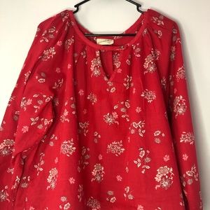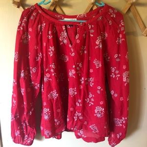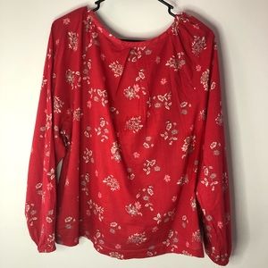Long sleeve floral blouse with cinched sleeves in a red/strawberry color.