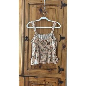 Pale pink cotton. Ties at bottom of front straps. Gathered areas are elasticized. Pit to pit measure is 18 inches. Length from top of straps is 22.5 inches.