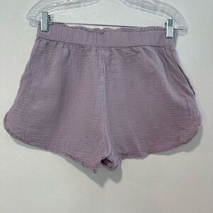 Cozy and lightweight shorts by Universal Thread. Made from soft gauzy cotton fabric in a muted lavender purple tone. Features an elastic waistband and relaxed fit for all-day comfort. Perfect for lounging, casual summer wear, or as a beach/pool cover-up.