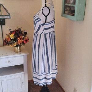 Super cute woven cotton dress for sunny weather. Straps button in back, elastic shirring there for fit. Button down front. Fully lined, Stripes turn at the bottom for a great finish. Size M measures 34-40 at chest, 31 under chest, 48 at hips, pockets here. 42 long from shoulder to hem. Perfect for now.